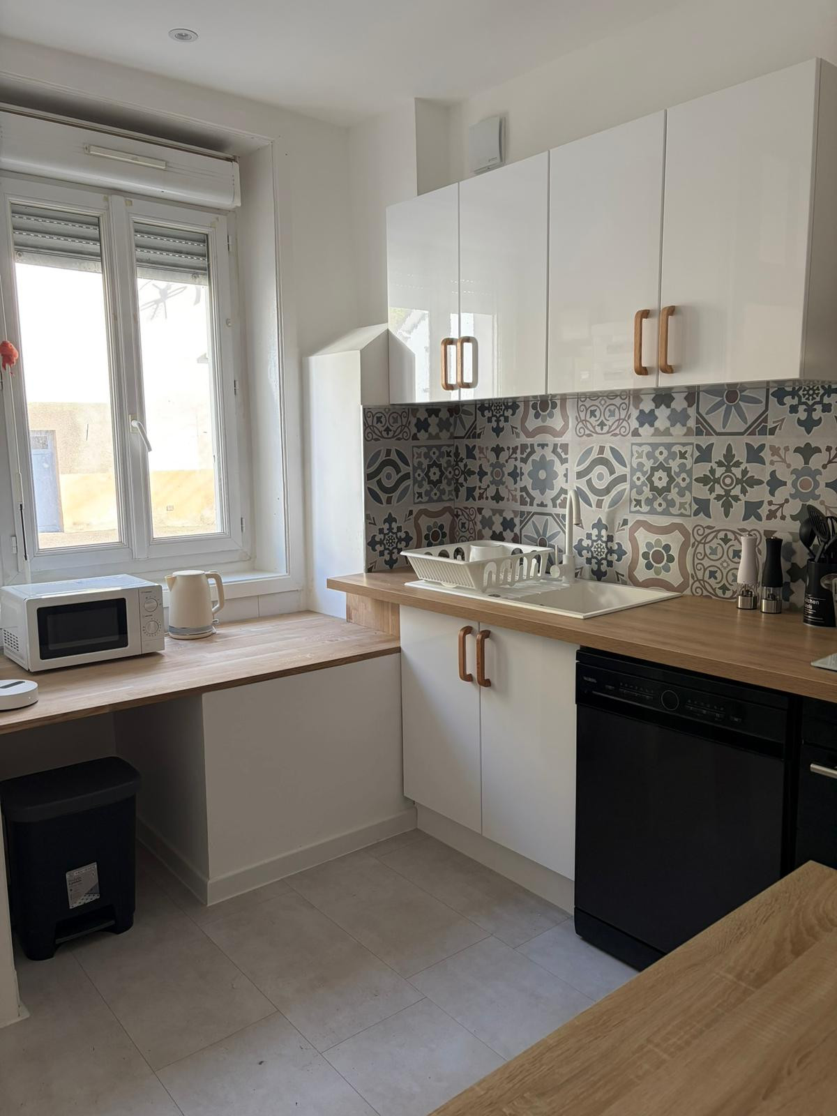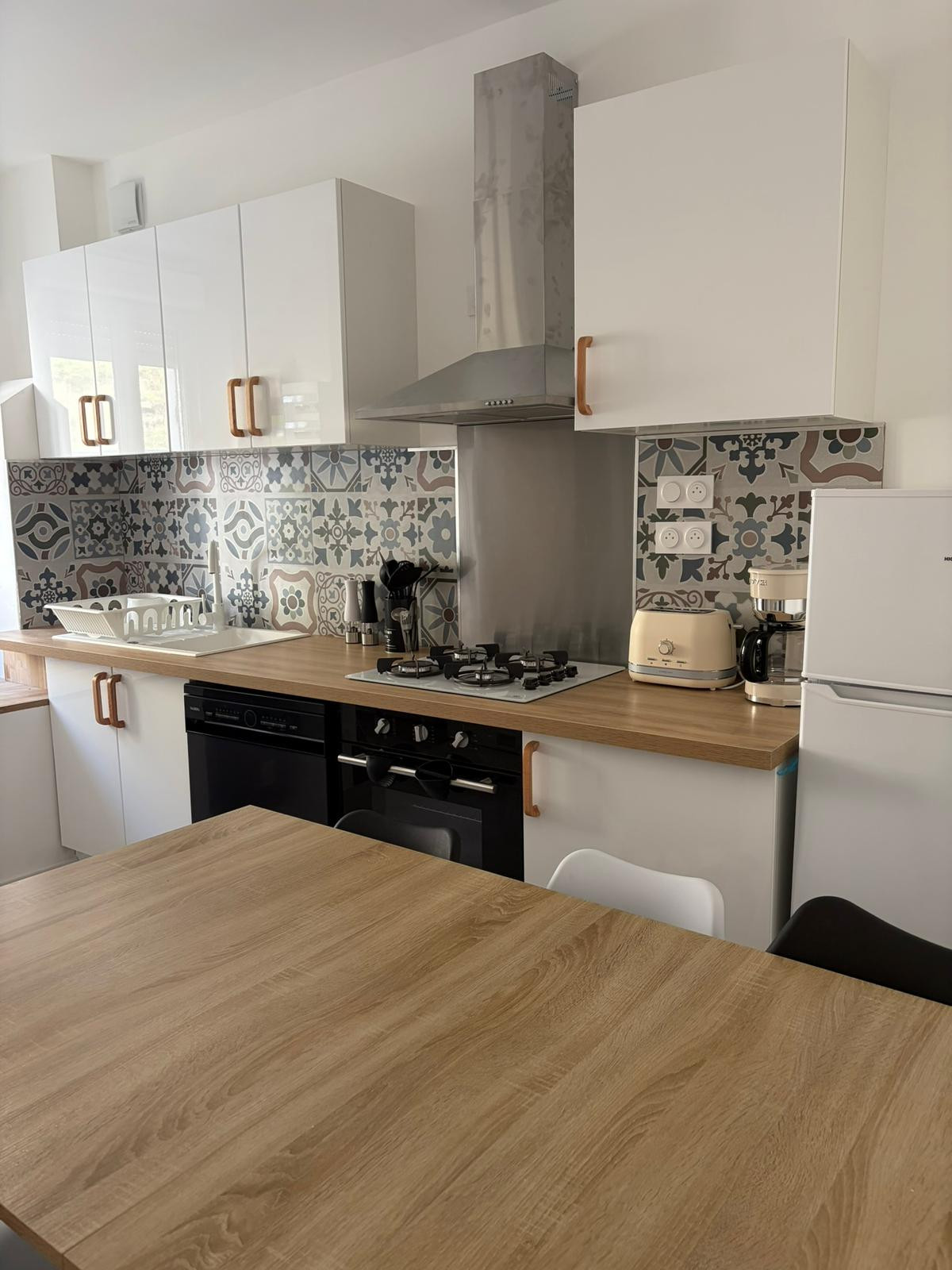 La cuisine américaine, équipée au gaz, est entièrement aménagée avec un réfrigérateur, un micro-ondes, un four, un congélateur, un lave-vaisselle, ainsi que toute la vaisselle, les couverts et les ustensiles nécessaires. Vous y trouverez également une cafetière, un grille-pain et une bouilloire.